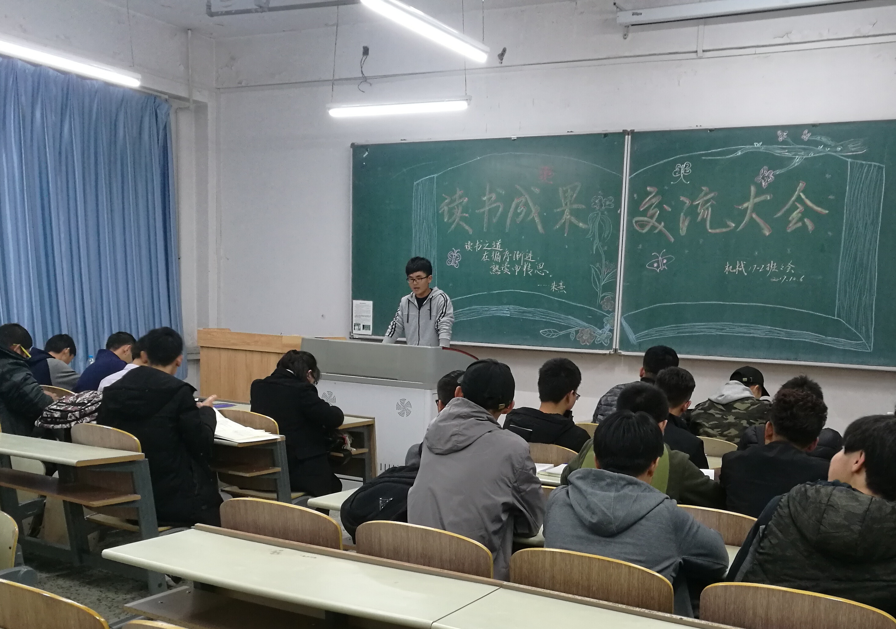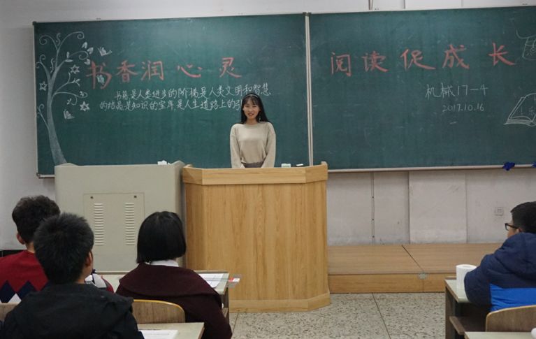 本次活动由机械学院团总支主办,机械学院学生会承办并统筹组织,张大为老师指导,各班级班主任、班主任助理及班长、团支书带领,全体学生共同参与,在晚自习时间于各班自习教室分别进行。活动要求机械学院17级20个班级同学以每月一本书的阅读量作为目标任务进行开展。本次活动中,各班级基本做到积极配合,尤其机械17-2班、机械17-4班、机械17-7班、机械17-8班、车辆17-1班与机电17-1、2班,开展形式多样的交流方式,班级同学间互动交流,并上台分享个人心得,也有部分班主任老师现场亲身分享读书经验。