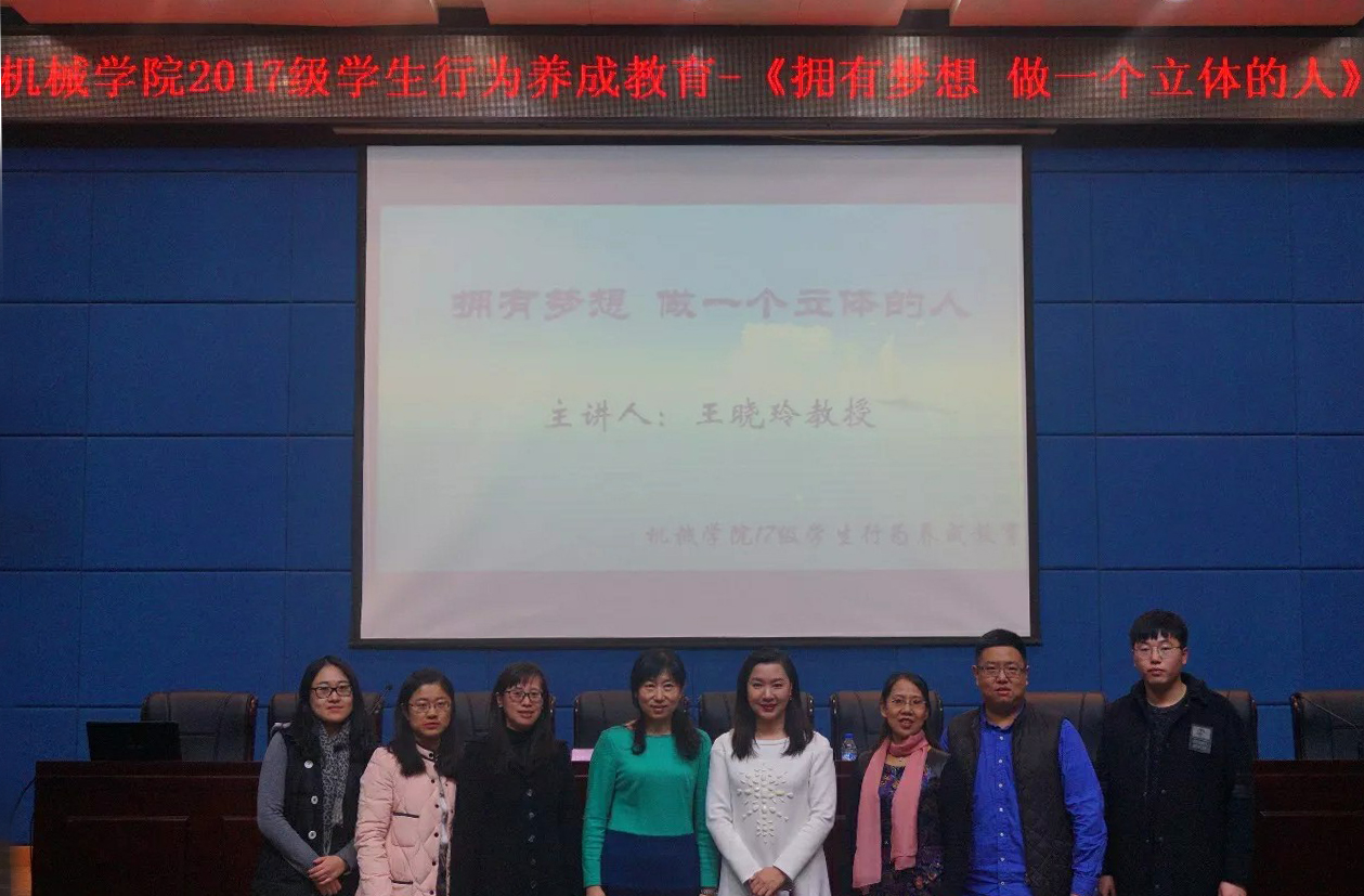 为引领我院学生坚定信念、树立崇高理想和人生价值观,不忘初心,牢记使命,立志成长成才,培养良好的行为习惯,过无悔的大学四年。机械学院特邀请哈尔滨师范大学王晓玲教授,于2017年11月17日晚18:00在西区新主楼E527举办2017级学生行为养成教育——《拥有梦想,做一个立体的人》专题讲座。我院党委书记邓彩霞、党委副书记兼副院长杨芳、机械学院全体辅导员、新生班主任、各组织学生干部及2017级全体学生参加讲座,全场座无虚席,气氛热烈。