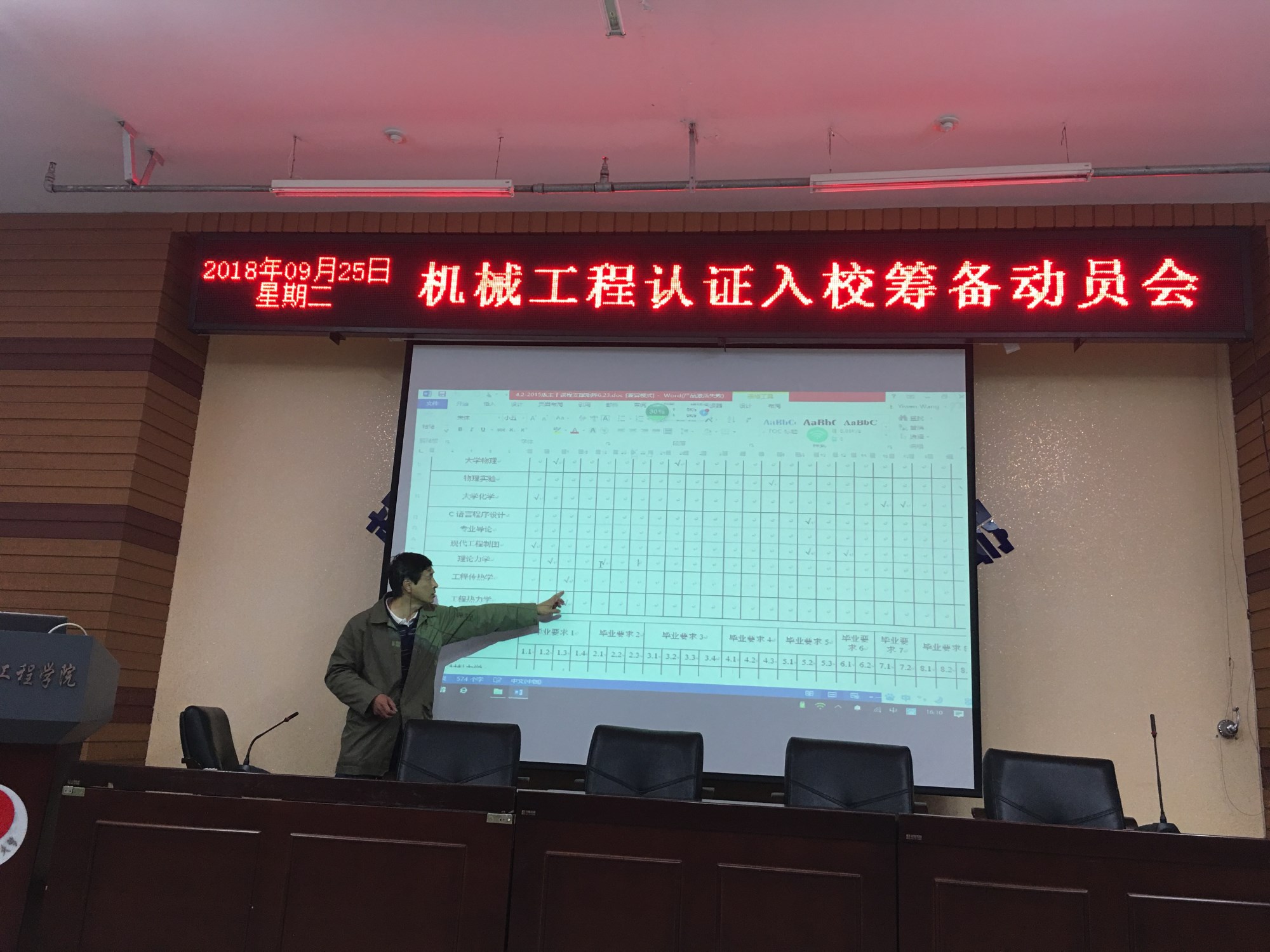 9月25日,根据现阶段学院工程认证专家入校工作准备情况,在消化整理校内工程教育专业认证专家组意见的基础上,学院召开了“机械专业工程认证入校筹备动员会”,机械设计制造及其自动化专业以及相关专业的全体教师参加了会议。王义文副院长对下一步工作进行了部署,段铁群教授详细讲解了毕业要求指标点的分解和课程的支撑要求,最后,刘献礼院长做了动员讲话。