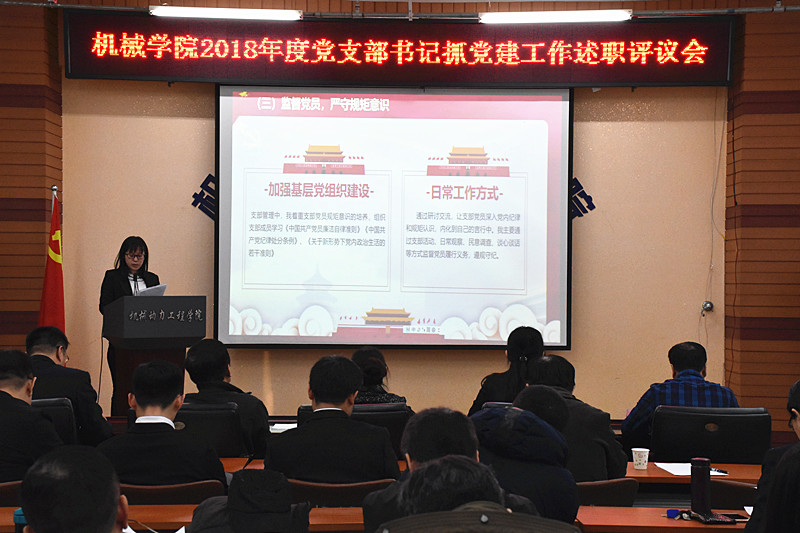 此次考核采取定性与定量评价相结合的办法,综合考量日常工作开展情况、党建工作考核检查情况、述职评议会上领导点评等情况,对支部书记抓党建工作情况形成综合评价意见。考核环节包括支部书记述职与现场问答两项内容。述职环节从履行职责情况、存在的主要问题及原因、下步工作思路和主要措施三方面进行,20位支部书记分别从教育党员有力、管理党员有力、监督党员有力、组织师生有力、宣传师生有力、凝聚师生有力、服务师生有力七个部分阐述自己的履职情况,主题鲜明、数据详实、重点突出、实事求是;在分析存在的主要问题及原因和提出下步工作思路和主要措施上,各位支部书记毫不退缩,结合工作实际,深入查摆问题,透彻分析问题,着力解决问题,思路清晰、目标明确、举措得当。车辆专业学生党支部书记、辅导员汤文侠结合PPT述职,图文并茂,亮点突出,得到好评。现场问答环节,由评委针对述职情况进行现场提问,各位支部书记从容不迫、对答如流。