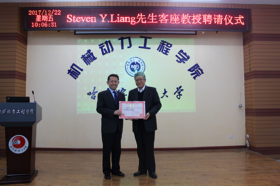 2017年12月22日上午,美国佐治亚理工学院Steven Y. Liang教授在新主楼C305会议室被聘请为我校客座教授。校长李大勇出席了聘任仪式,科技处副处长相征,国际合作交流处孙济才,机械学院院长刘献礼、院党委书记邓彩霞、副院长姜彬、王义文、副书记杨芳及部分教师和学生代表参加了聘任仪式。