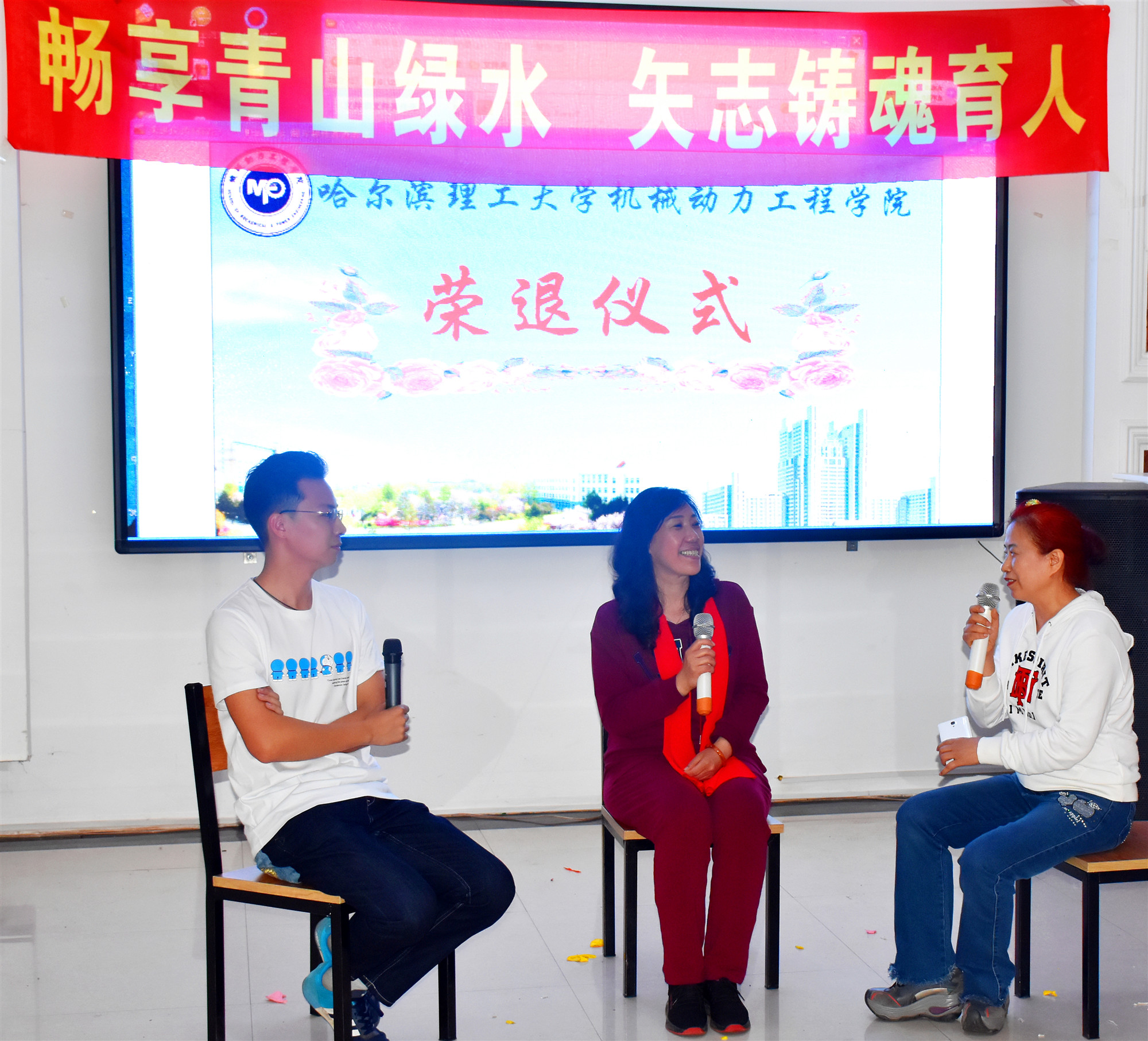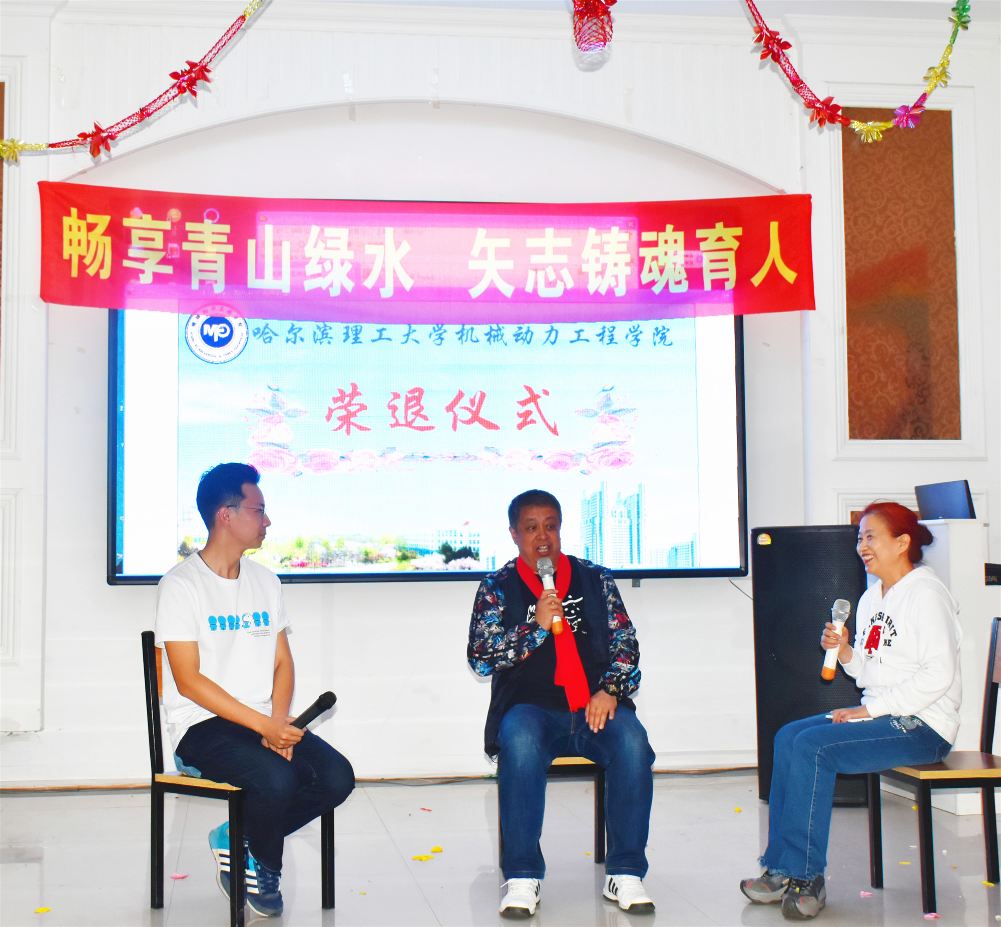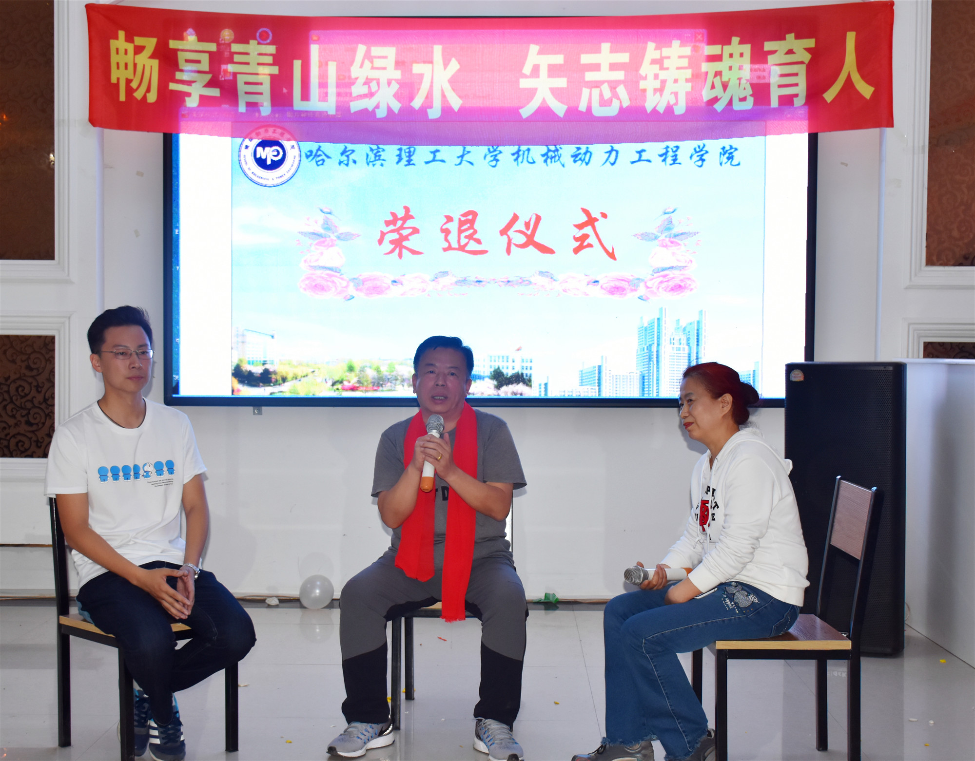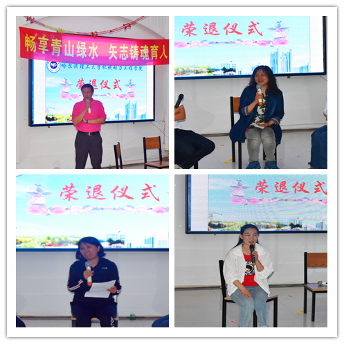教师们畅享了青山绿水后,愉悦地参加了为机械工程实验中心支部书记李永海、工程图学系李喜华和田静三位教师举办的荣退仪式。首先,工程图学系主任李平老师、机械工程实验中心副主任严复钢老师、副主任王亚萍老师、青年教师代表马晶等分别讲述了荣退教师在各自岗位上潜心育人、默默奉献的生动事迹,全体教工纷纷表达了对荣退教师们未来生活的美好祝愿和衷心祝福。随后,机械工程实验中心的青年教师赵培轶和老教师刘敏对三位荣退教师分别进行了亲切访谈,三位荣退教师向大家分享了自己在教育岗位几十年的感悟与收获,脸上洋溢着教书育人的自豪感和幸福感,深切表达了对学院和学校的不舍之情。他们一致表示,机械学院已然成为了自己的第二个家,虽然已经离开了工作岗位,但仍时刻心系学院和学校,并乐于发挥余热,在荣退后继续为学院、学校尽自己的微薄之力。在场的教师被他们不平凡的教师生涯所打动,纷纷表示将以他们为榜样,在平凡的事业中做出更多不平凡的贡献,为学院、为学校、为教育事业奉献自己的智慧和力量。学院翩翩舞蹈队的女教师们也专门为三位荣退教师编排了精彩的舞蹈,用婀娜的舞姿表达了对三位教师的敬仰和留恋之情。最后,刘献礼院长和邓彩霞书记分别发表讲话,感谢三位荣退教师对学院工作的大力支持和无私奉献,对他们几十年辛勤工作给予高度评价,同时也希望荣退教师把他们的教学经验以及对教育的情怀、崇高的师德、爱岗敬业的精神传承给青年教师。祝愿他们的生活丰富多彩、身体康健,希望他们一如既往关注学院和所在系或中心的发展。