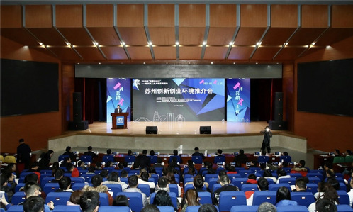 学生代表在学生活动中心301剧场参加了苏州创新创业环境推介会,推介会上,苏州市委常委、组织部部长陆新上台致辞,为大家详细介绍了苏州的创新创业环境。