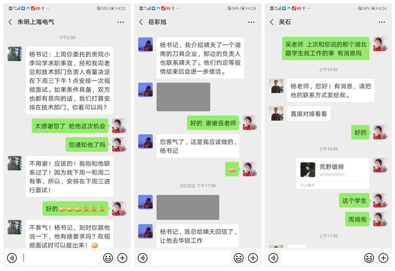 截止4月1日,累计对132名未就业学生进行了电话就业指导和就业帮扶。重点关注湖北籍学生的就业情况,学院副书记杨芳依托校友资源,联系上海捷锦电力新材料有限公司副总经理朱明为湖北籍学生提供就业岗位,学院教师吴石、岳彩旭两位教师帮助学生落实就业单位。学院9名湖北籍学生中已有3人成功签订就业协议,1人准备考研复试,4人已准备签约或正在进行网络面试,1人决定继续考研准备“二战”。