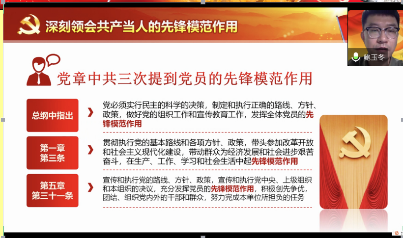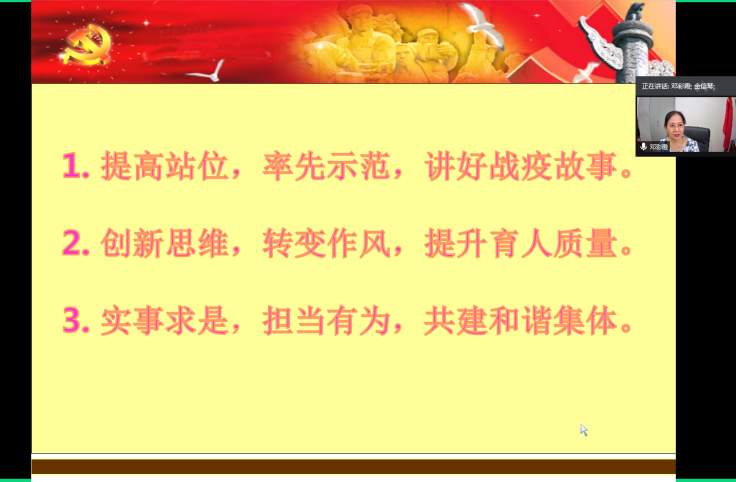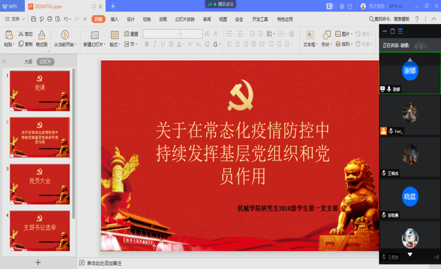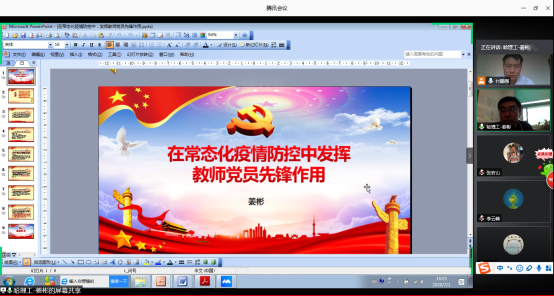学院各基层党支部也纷纷开展线上专题党课。机械设计及其自动化系党支部书记陈涛以“彰显党员本色,争做合格党员”为主题,工业设计系党支部书记金信琴以“疫情防控中如何落实三会一课制度”为主题,工程图学系党支部书记赵燕江以“抗击疫情 中国力量”为主题,实验中心系党支部书记付鹏强以“在平凡岗位中彰显党员风采”为主题,车辆工程系党支部书记吴石以“永远忠诚于党”为主题,机械基础系党支部书记鲍玉冬以“发挥党员先锋模范作用,在抗疫实践中诠释”为主题,能源与动力工程系组织委员刘晓刚以“庚子战疫,有你有我”为主题,研究生2018级学生第一党支部以“关于在常态化疫情防控中持续发挥基层党组织和党员作用”为主题,研究生2018级学生第二党支部以“疫情防控在行动”为主题,研究生2019级学生第一、第二党支部以“在战‘疫’中展现共产党人政治本色”为主题,能源学生党支部以“感悟中华力量,强化使命担当”为主题……分别在各自支部召开了生动的微党课。通过此次党课,各师生支部党员深受鼓舞,踊跃发言,为支部创建工作出谋献策,纷纷表示将在今后的教学、科研和学习中一如既往,真抓实干,为学院发展贡献力量。