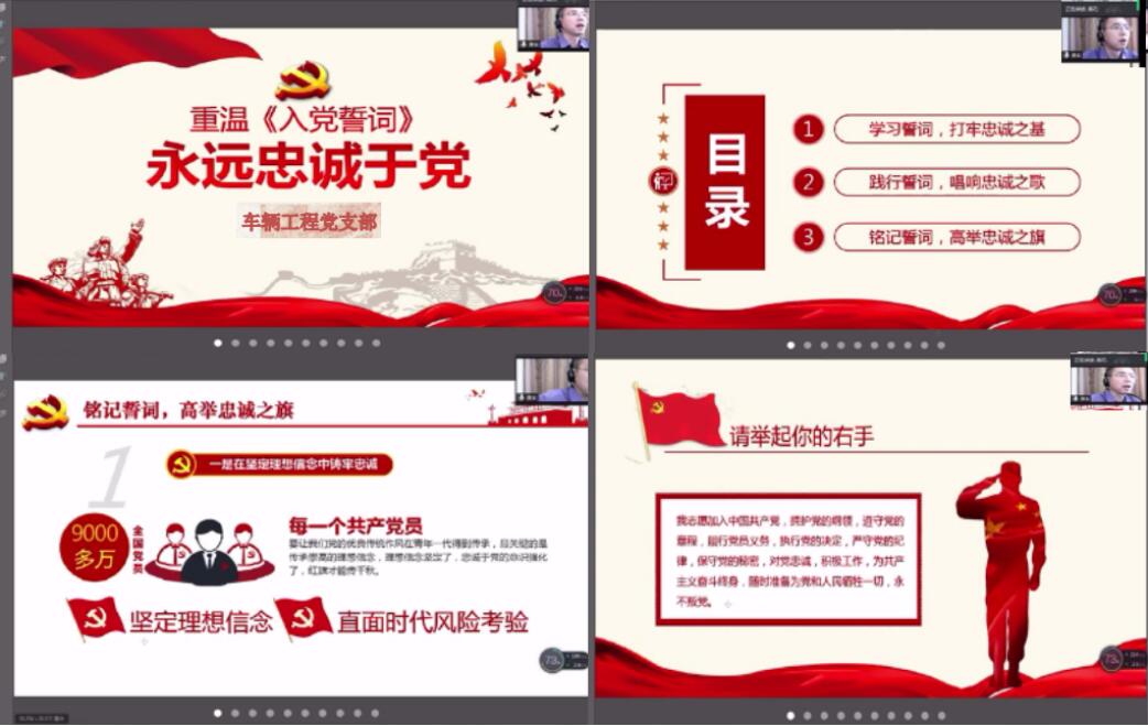 各师生支部党员重温入党誓词。在微党课中,全体党员举起右手,庄重宣誓,一句句铿锵的誓词,一声声真诚的宣誓,再一次表达共产党员“随时准备为党和人民牺牲一切”的初心和誓言。
