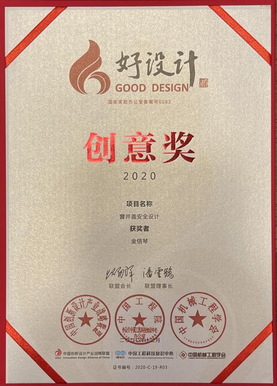 2020年7月,我校参赛团队通过国家唯一官网提交作品《窨井盖安全设计》,参加 “好设计”东北赛区比赛并于10月获得东北赛区一等奖,由东北赛区推送至“好设计”全国评审,通过函评角逐,成功入选50项作品的最终评选。经过专家严格公正的评审,本次大会揭晓并表彰了10项金奖、20项银奖、40项创意奖、30项提名奖。