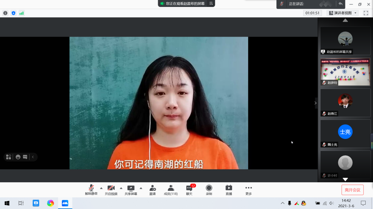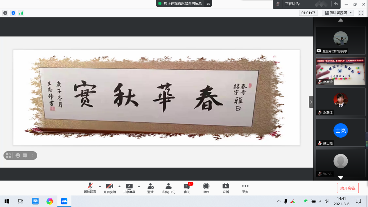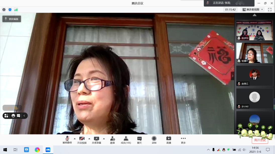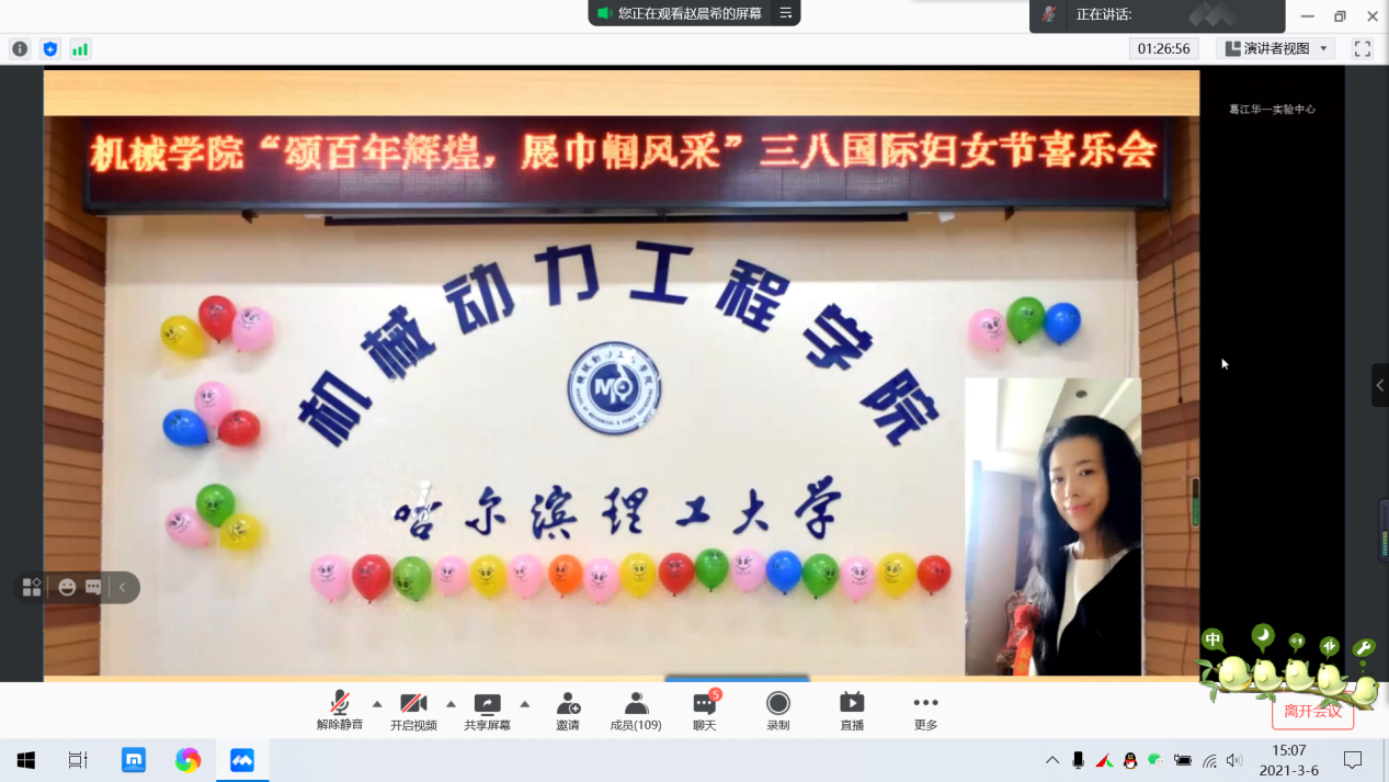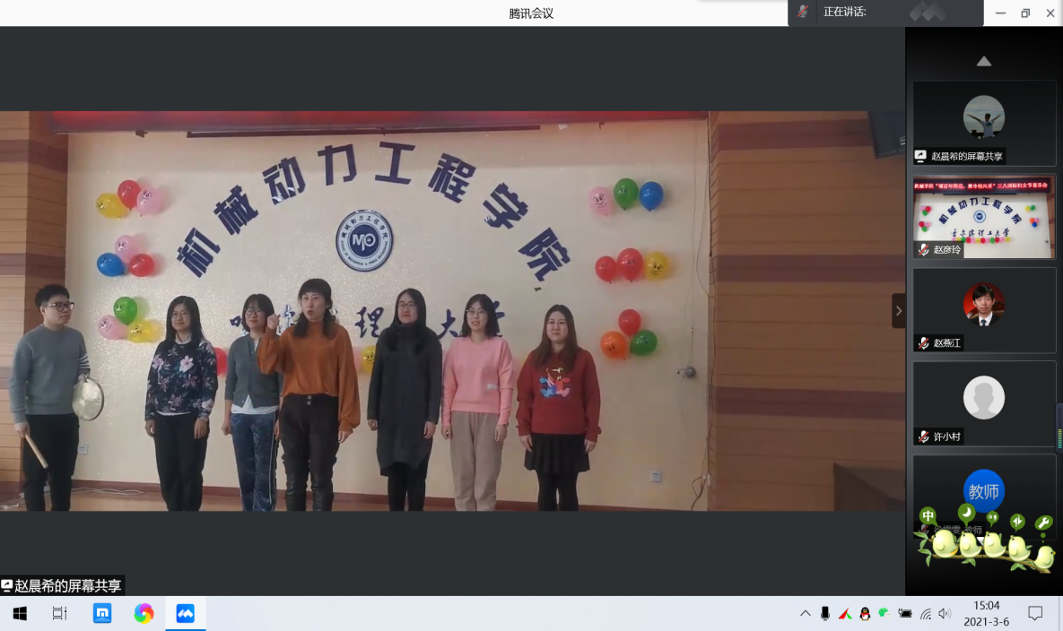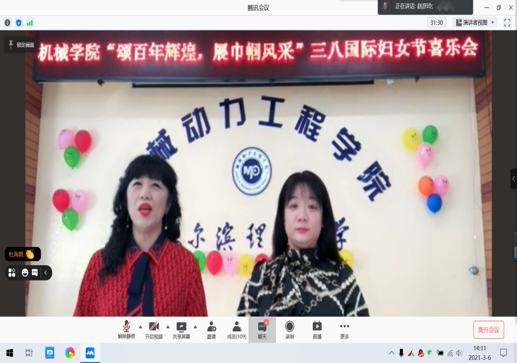 2021年是中国共产党成立100周年,是“十四五”开局之年,更是纵深推进机械学院建设之年。为喜迎第111个“三八”国际妇女节,展现学院女教师风采,进一步激发全院女职工爱国、爱校、爱院、爱岗敬业的热情,机械学院开展了以“颂百年辉煌,展巾帼风采”为主题活动的三八国际妇女节喜乐会。为落实防控疫情要求,本次活动通过线上直播方式进行,有100余名教职工在线观看直播。机械基础工程系副主任赵彦玲教授和院办公室李芳明老师做主播。