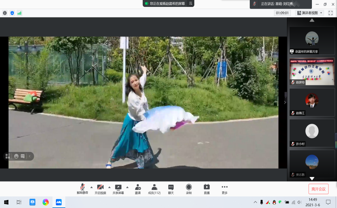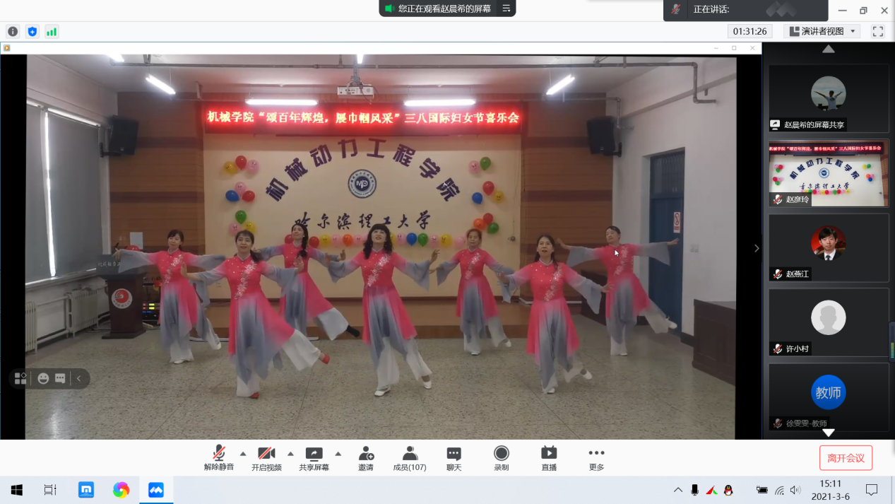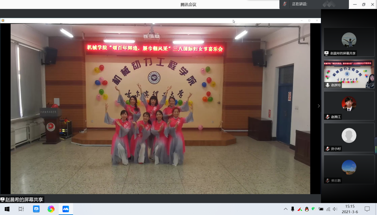 本次喜乐会为与庆祝第111个“三八”国际妇女节相呼应,分三个环节开展了“三个一”活动,即一个美丽瞬间,一个才艺展示,一份巾帼情怀。活动在回顾女教师翩翩舞蹈队多场精彩演出的喜乐气氛下拉开序幕,伴随着院长刘献礼、副院长姜彬和张元、正处级组织员刘长军及机械基础工程系男同胞们对全院女教师的视频祝福,进入第一个环节:美丽瞬间,刘献礼院长通过共享一张张照片,讲述学院女教职工在爱国、爱校、爱院、爱岗敬业的精彩故事,其中不乏他们悉心指导学生,在疫情期间不辞辛劳帮学生打包邮寄行李的辛苦身影,从这些不平凡的瞬间让教职工看到了机械学院巾帼们奋战的身影,充分展示了学院女性的风采。在第二个环节:才艺展示,学院女教师用才艺抒发家国情怀,彰显巾帼魅力,展示出她们自尊、自信、自立和自强的一面。她们悦耳的歌喉、优美的扇子舞、隽永的书法、精湛的厨艺……让人赞不绝口,为大家带来了一场绝美的视觉盛宴。在第三个环节:巾帼情怀,工程训练中心的女声小合唱、学工队伍的三句半、女教师翩翩舞蹈队的舞蹈将本次活动推向高潮,传承红色基因,传播正能量。随后,省巾帼建功标兵葛江华老师代表女教师发言,表达了女教师的心声,她深情地表示:“作为女教师,和男同胞们一起挥洒汗水,一起努力,共同建设家园,这一切都源于社会对于女教师的关注和重视,源于同仁之间的合作,源于家人的支持和努力。在此,向支持女教师们的所有人表示感谢!也祝女教师们节日快乐!”