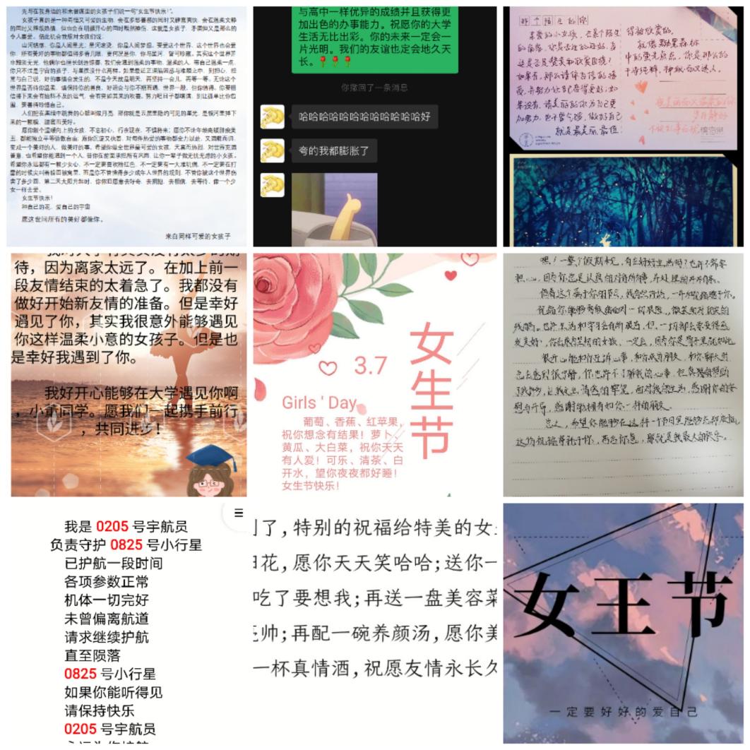 在“DIY创意手工制作”活动中,通过纸花、灯笼、雕塑、玩偶等DIY创意手工作品展示了我院女生的独特魅力与风采。“只想对你说”活动,为同学搭建相互了解沟通的平台,通过明信片,写信,录视频等方式对我院女生送上最真挚的祝福。
