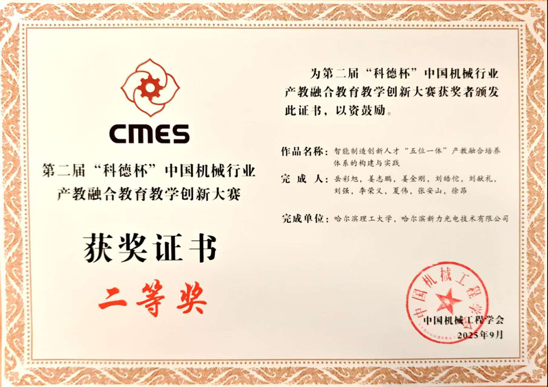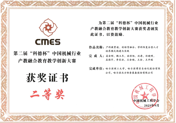 2025年9月19日-21日,在广州召开的第二届“科德杯”中国机械行业产教融合教育教学创新大赛全国总决赛上,机械学院与哈尔滨新力光电技术有限公司共同完成的“智能制造创新人才‘五位一体’产教融合培养体系的构建与实践”教学成果,与哈尔滨博实自动化股份有限公司、哈尔滨北方防务装备股份有限公司共同完成的“产科教贯通、创转育融合:学科际复合型工程人才培养模式构建与实践”教学成果,分别荣获研究生组全国总决赛二等奖和本科组体系类全国总决赛二等奖。