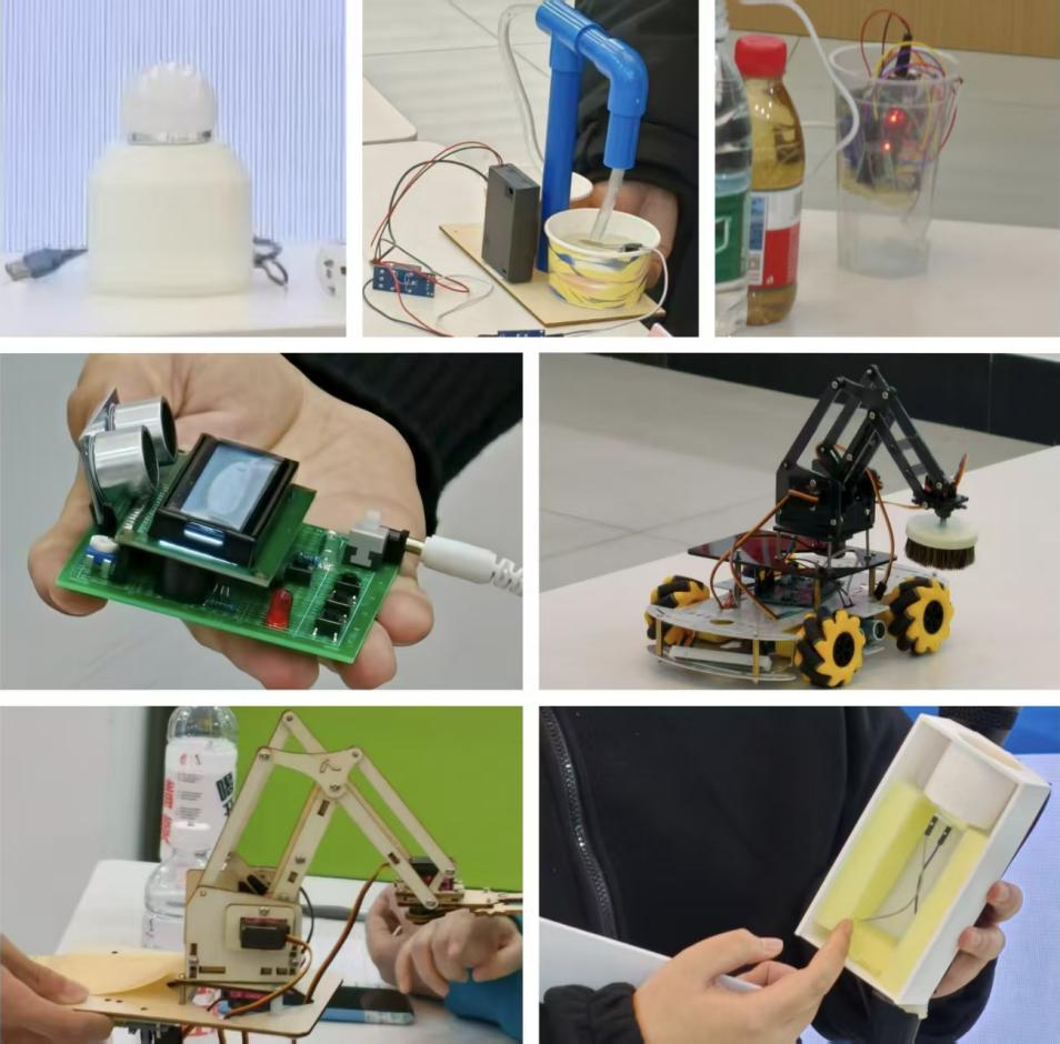 经过评委团对作品设计迭代、技术功底及现场答辩的综合考评,最终评选出一等奖1项、二等奖2项、三等奖4项。其中,《智能语音控制小夜灯》斩获一等奖;《超声波视力保护仪——坐姿矫正器》《智能墙裙清洁机器人》荣获二等奖;《茶姬水哨发动侦察者》《爬蛛式高空作业机器人》《吸尘黑板擦》《智能节水自动停泵装置》获得三等奖。