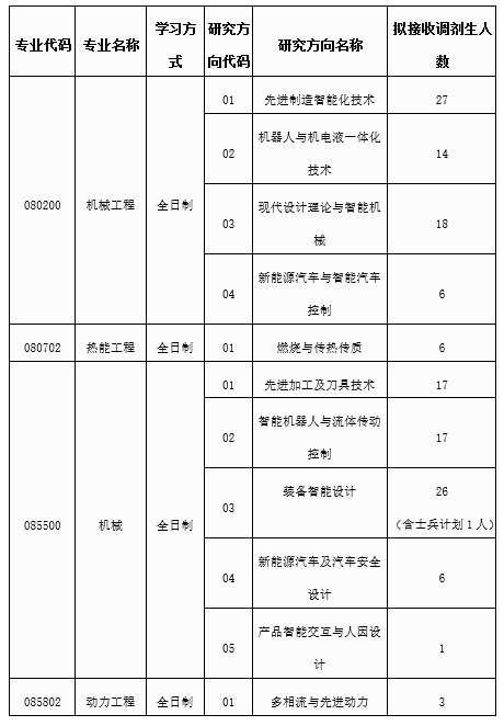 2026年,我院机械工程学科(学科代码080200)、热能工程学科(学科代码080702)、机械专业学位(领域代码085500)、动力工程专业学位(领域代码085802)接收调剂生,各方向招收调剂人数下表。